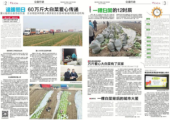 根據(jù)本次”愛(ài)心助農(nóng) 溫暖冬季“公益活動(dòng)相關(guān)規(guī)劃,企業(yè)購(gòu)買(mǎi)的60萬(wàn)斤大白菜將分批發(fā)放到青島市內(nèi)四區(qū)以及濟(jì)南、淄博、東營(yíng)、珠海、澳門(mén)共計(jì)40家福利院養(yǎng)老院。