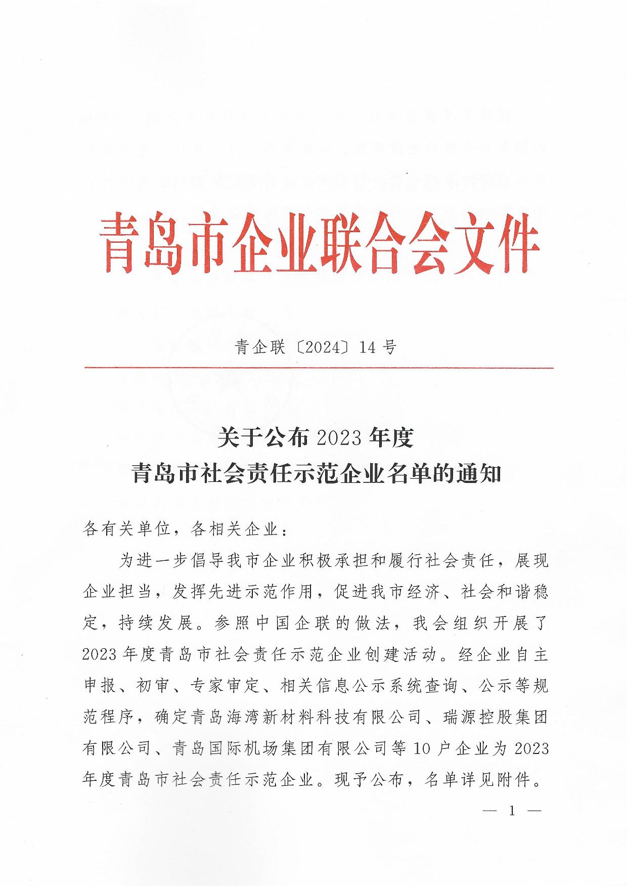 關(guān)于公布2023年度青島市社會(huì)責(zé)任示范企業(yè)名單的通知